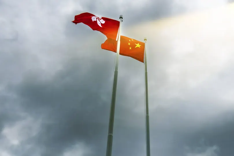 在风云变幻的天空下,五星红旗与香港特别行政区区旗并肩飘扬。红旗上的五星闪耀着国家的荣耀与力量,区旗上的洋紫荆花象征着香港的独特与繁荣。它们一同舞动,诉说着香港与祖国血脉相连的深情,彰显着“一国两制”下香港的蓬勃生机与美好未来。