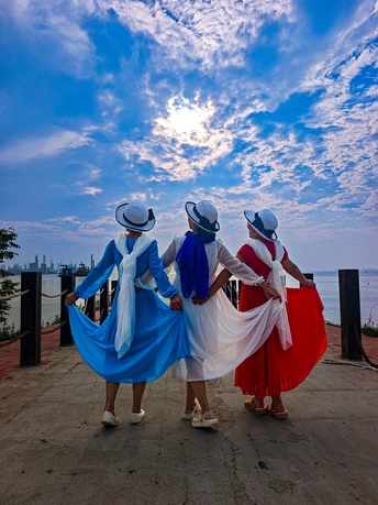三位姐妹,在暮色时分,相聚于水畔。同款帽饰,不同色的裙装,像生活里多样的精彩。手挽手,望向远方,是对往昔情谊的珍视,也是向新风景的奔赴。这一幕,把岁月沉淀的默契,融进海天交界的温柔,让平凡日常,开出浪漫的花,成为心底永不褪色的美好剪影 。