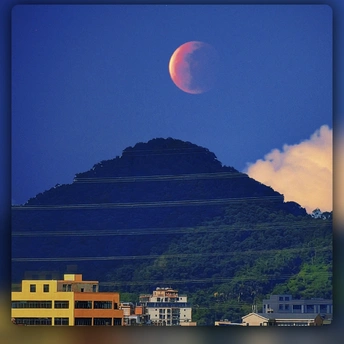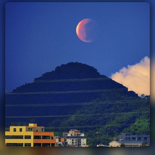 黄昏下对面金字塔形的山,在夜幕下像一堆草垛,山前的一排白色的高压电线把山均匀分割成很有层次感,象金字塔的台阶石,这是我们中国的金字塔吗!