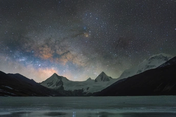 2025年春节假期,在黎明前的黑暗中拍下银河从雪漠峰和格桑塔措上方升起