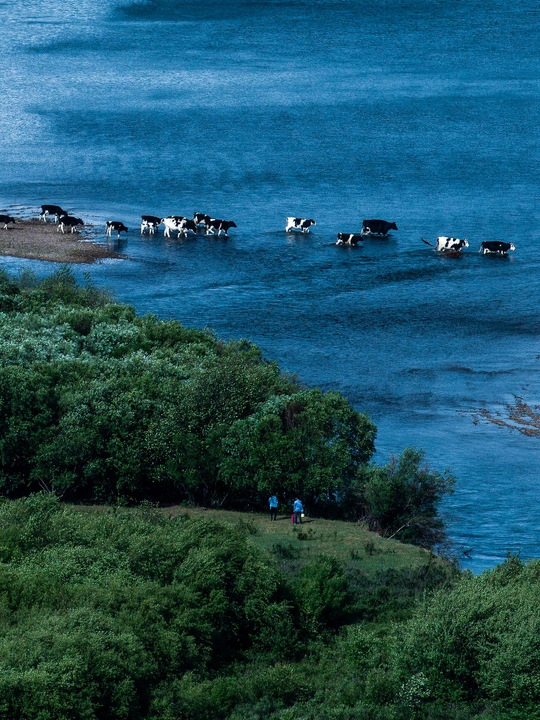 夏天,风吹过额尔古纳河畔,牛儿在慢悠悠蹚水溜达,湿地绿茵里有人在看风景,河里有云影。。。