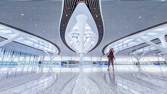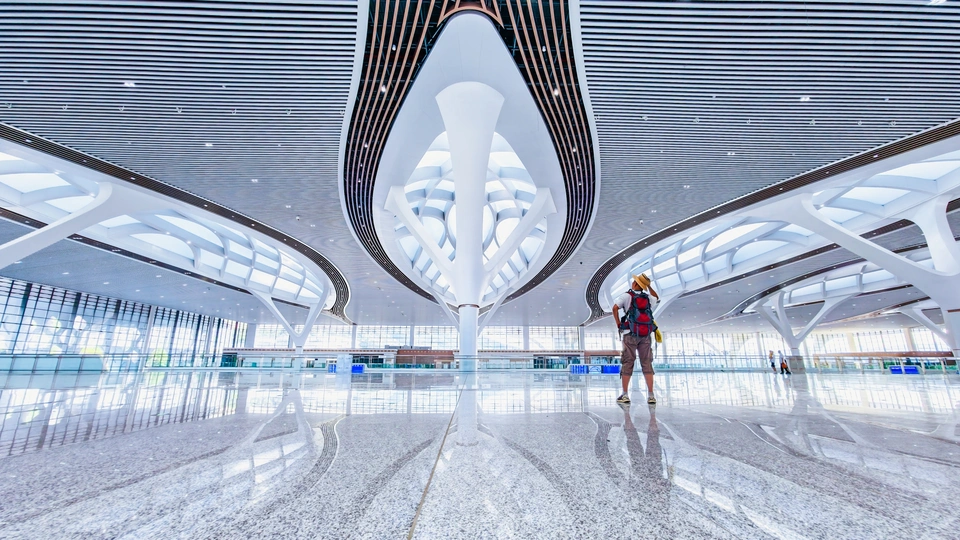 流线穹顶切割出几何光带,行人的剪影在纯白空间里延伸,仿佛穿梭未来时空的静谧隧道。弧形钢骨如展翅的羽翼,托起旅人飞向远方的渴望,阳光为每一寸金属镀上轻盈。