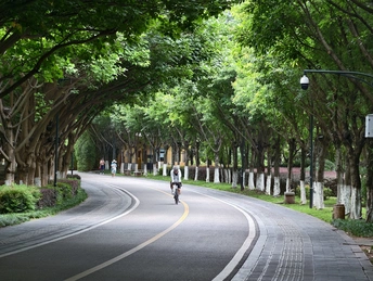 雨后湿地步道,骑行的人少了很多,阴天,但是任可见光从树顶透出,等了许久,终于见到骑行者经过。