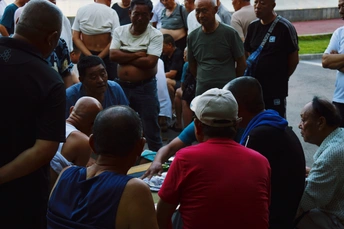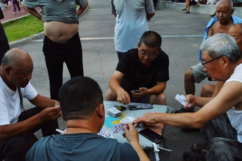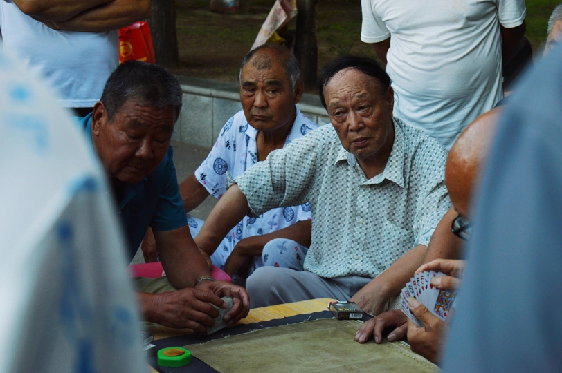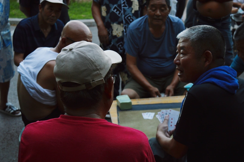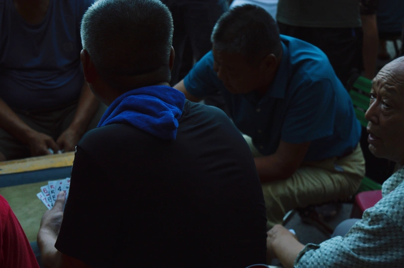 老城区的公园中,一群老人会定时聚在一起打牌聊天,吵吵杂杂,好不热闹……