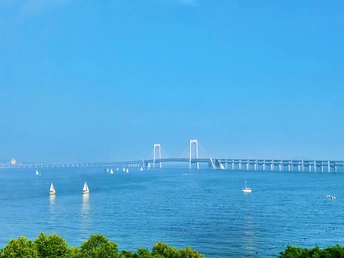 在天气预报有暴雨,但居住在海边见惯了大风大浪的人们,都是有处不惊的气魅,只要不见雨的迹象一切照旧,纵然招遇,大不了从头在来;就是暴风雨来临之前那份短暂的宁静使很多人心存侥幸,经验打折。本图所摄画面也是在此景况下拍的,蔚蓝宽广的大海上,一座垮海大桥,贯穿左右,平添了几分梦幻,几分远方,海面上星星点点的散撒着几艘悠闲的帆船,偶尔有几只海鸥戏嘻绕着,不时传来几声鸥鸣和浪拍岸边的声音,好一幅油画大作。十分钟后一场大雨洗礼了每位入场参演者,本人切身体会。