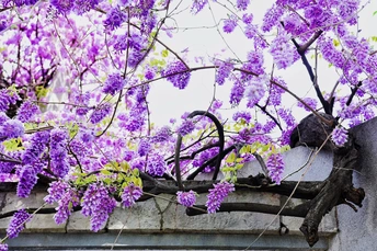 紫藤花如梦如幻,藤杆蜿蜒如龙蛇,越墙而上,攀缘而生。花朵簇拥成串,如紫色的风铃,随风摇曳,散发出淡淡的清香,仿佛在诉说着春天的故事。