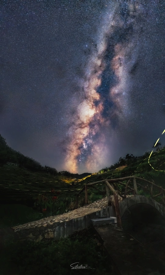 夜幕低垂,璀璨银河如一条熠熠生辉的天路,横跨于深邃苍穹。它汇聚着无数闪烁星辰,承载着宇宙的神秘与浩瀚。下方的山谷间,萤火虫轻盈飞舞,宛如点点流动的荧光精灵。它们与静谧的石桥、葱郁的草木相映成趣,在这方天地间,勾勒出梦幻般的夏夜图景,让自然的浪漫与宇宙的宏大在此交融。