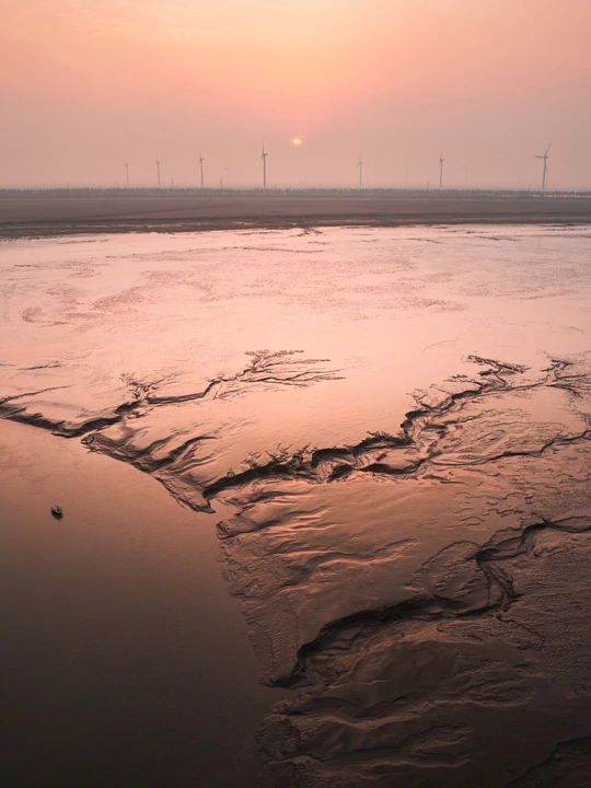 落日余晖倾洒滩涂,浅滩纹理如大地脉络延展。远处风电伫立,叶片似在余晖中轻吟,自然的柔美与工业的硬朗悄然交融,静谧间,时光慢淌,绘就一幅独特的黄昏剪影 。