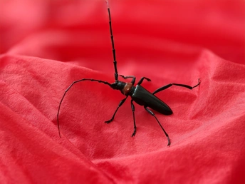 一只天牛忽然落在了衣服了,赶紧脱下衣服拍了下来。