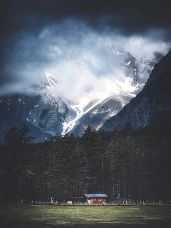牦牛坪青草如茵,玉龙雪山在云雾中若隐若现,雪光穿透云层,与下方葱郁树林相映,静谧而神圣。