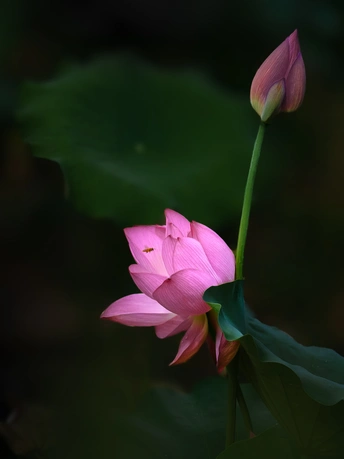 噙露粉莲,蜂儿驻足。一苞轻摇,静候时光。盛放与期待,同框。