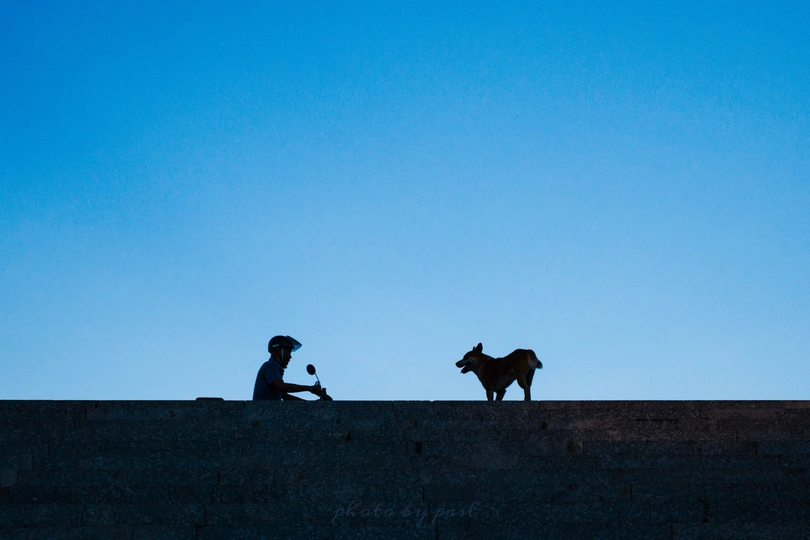 清晨,想拍堤坝上的路人,正好狗狗走了上去,与骑车的路人相对峙,据说,狗眼看人低,毫无畏惧!