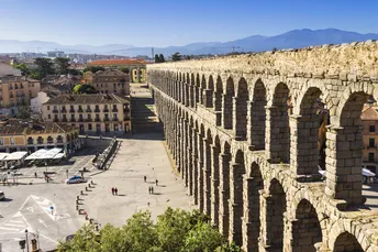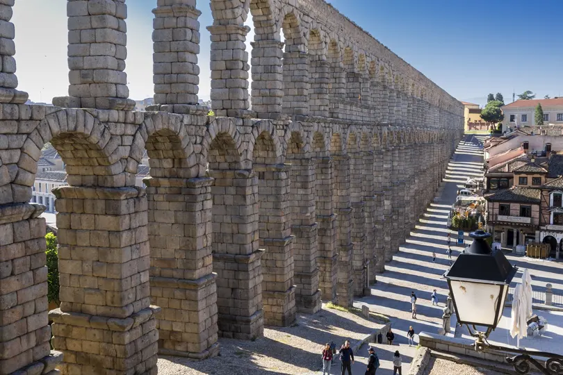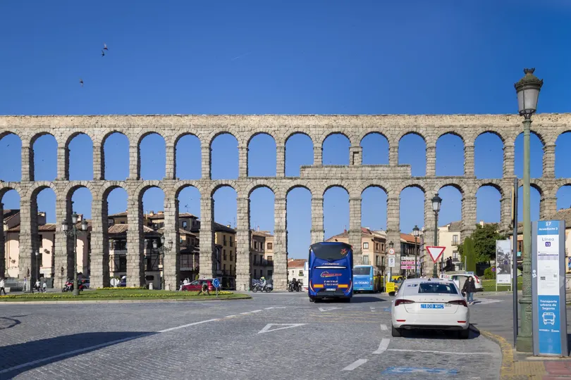 当大巴驶入塞戈维亚时,远远便能看到这座著名的古罗马高架水渠,它像是一张巨大的渔网,横挂在街道上,强烈的视觉冲击感扑面而来。这座引水渠,作为古罗马时期的工程奇迹,目的是將18公里外的弗利奥河水引入城内饮用。令人不可思议的是,这座引水渠使用了数以万计的花岗岩块,每块重量可达两吨,石块间没有使用任何粘接材料,经历两千多年的风雨洗礼依然稳如磐石。可见引水渠的设计和建造展现了古罗马人在建筑技术和智慧方面的卓越成就。 是罗马人在西班牙留下的一项宏伟工程,