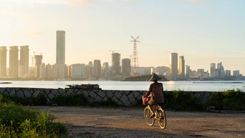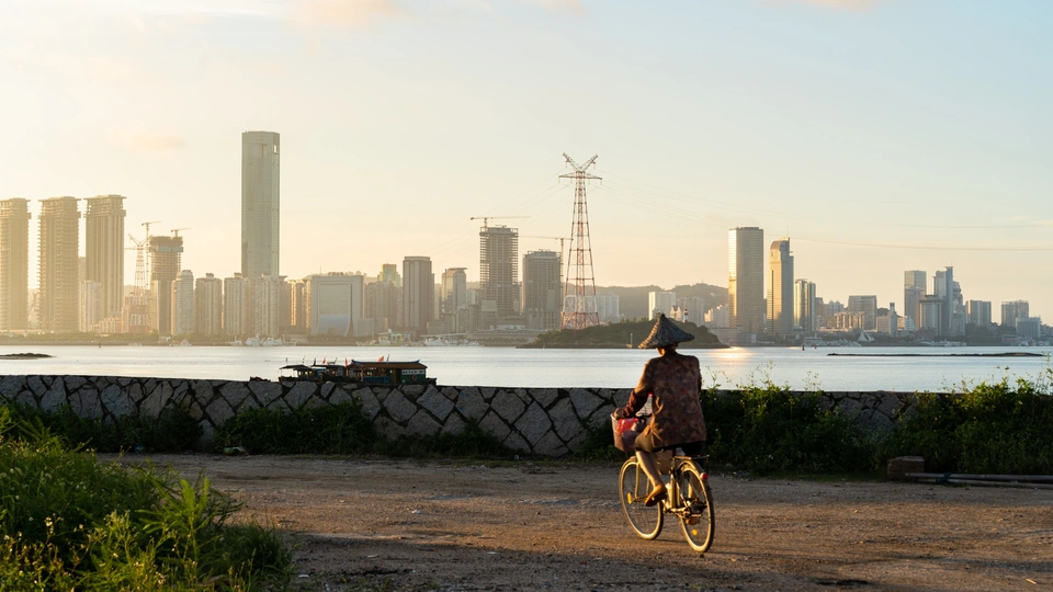 早晨的厦门海边,迎着日出的闽南阿妈骑着自行车往海边赶着出海,远方的鹭江道高楼大厦与之形成鲜明的对比