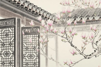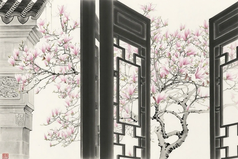 粉白玉兰绽于枝,古雅窗棂映清姿。 黛瓦回廊藏幽意,一笔春痕入画诗。