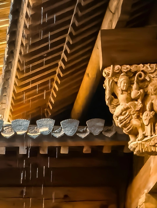 在济南的安徽人家,拍摄了徽派建筑屋檐下的木雕和雨丝,表现中式徽派建筑文化及禅意。