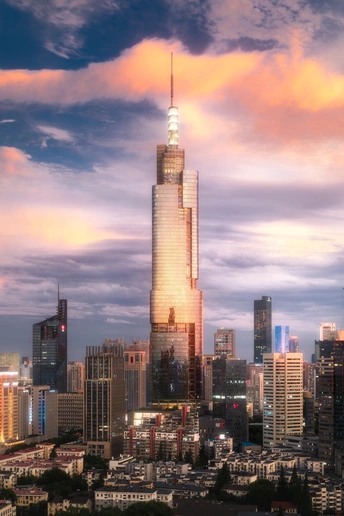 最近入夏出梅的南京,护城霾也在一阵阵雨水的冲刷后消失不见,挑了一个非常通透的天气来拍紫峰的反光,当西面晚霞燃起,对面的天空也被染成了温柔的橘粉色,仿佛精致的油画一般。紫峰大厦在余晖中矗立,好似利剑般直上云霄,在晚霞的映衬下,闪耀着金色的光芒