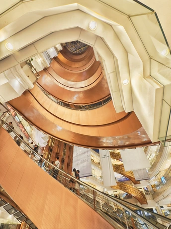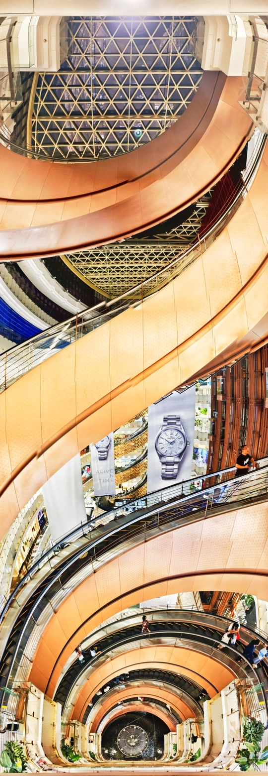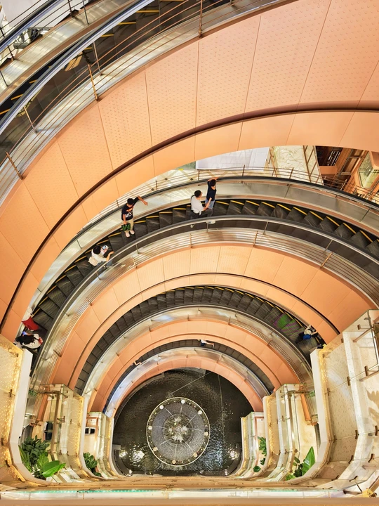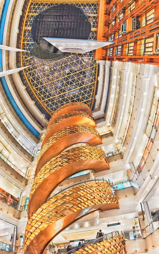 上海大丸百货的螺旋电梯宛如一条金色的盘龙,蜿蜒盘旋,散发着令人瞩目的光芒。它以独特的建筑美学,吸引无数人前来打卡拍照。