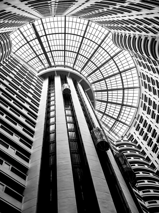 在济南山东大厦,低机位仰拍大堂的穹顶和建筑内部线条,营造一种视觉冲击力和科技感。