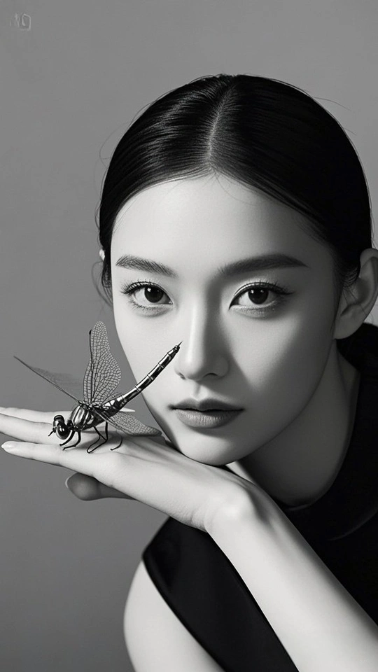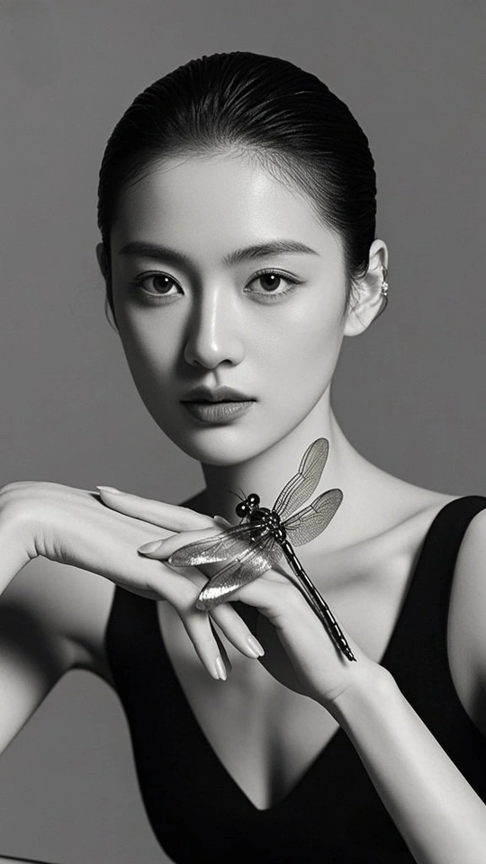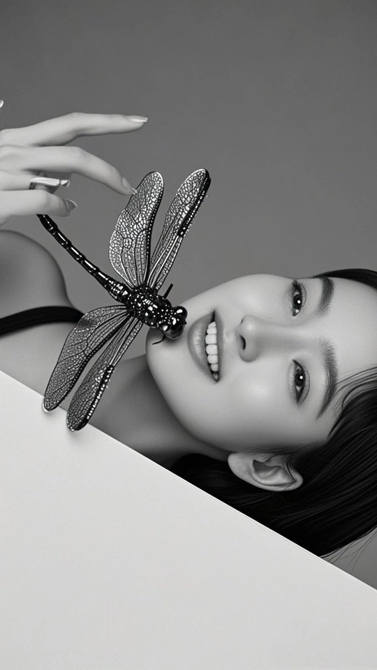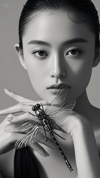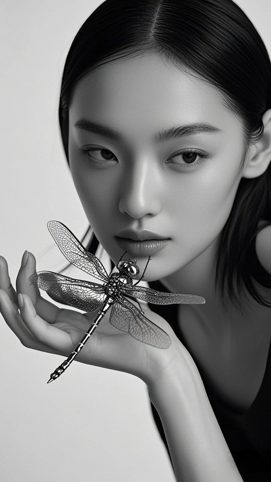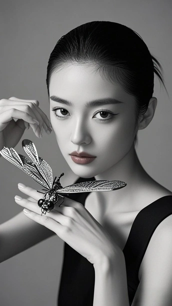在黑与白的交界 金属蝴蝶 振翅 停驻在掌纹的岛屿 发梢收束起喧嚣 目光如银线 穿引 时间的缝隙 蝶翼刻满沉默的纹路 每一道 都在说 关于光与影的絮语 皮肤是月光的容器 盛放着 黑的静谧 白的呼吸 当指尖触碰金属的凉 蝶影便爬上瞳孔 孵化出 一整个 无声的 星芒夜曲