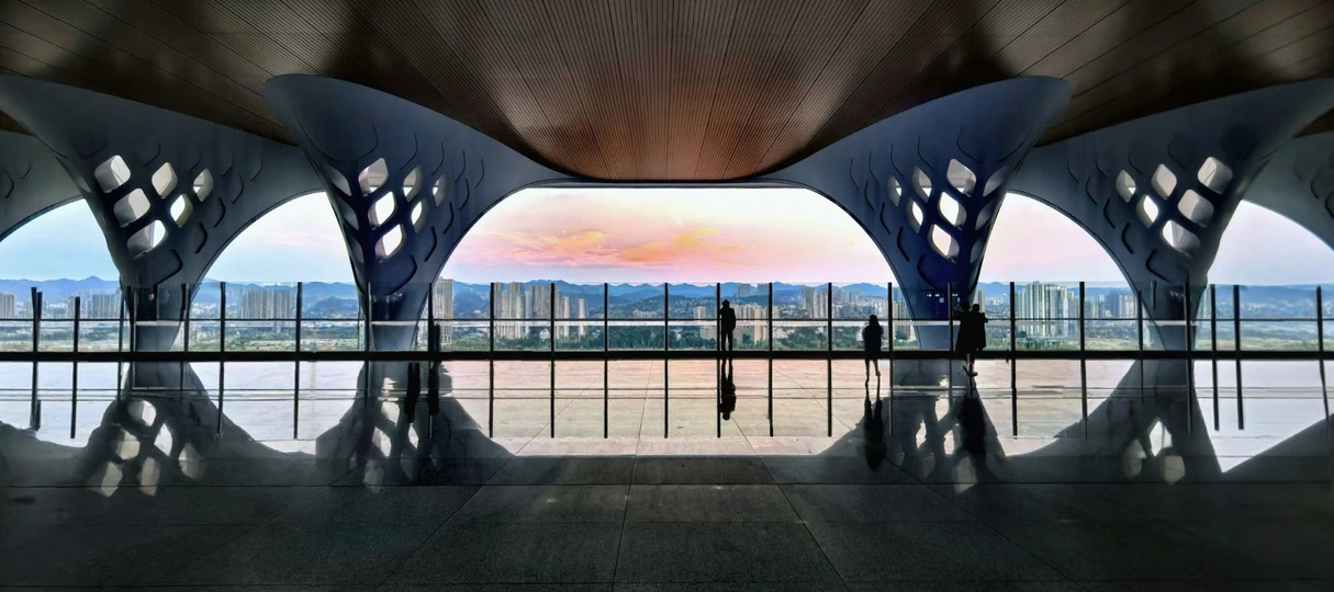 重庆东站,建筑美学典范。灵动曲线勾勒现代轮廓,镂空设计引入自然光影。人来人往,与城市天际线共绘画面。它不仅是交通枢纽,更承载着城市的活力与未来,是重庆发展的新名片。