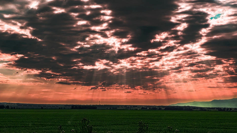 画面中展现出一幅壮丽的自然景象。天空布满了厚重的云层,云朵呈现出深灰与粉、红交织的色彩,霞光透过云层洒下,形成一道道绚丽的光线,仿佛是从云端射出的金色箭矢。下方是一片广袤的绿色田野,绿意盎然,生机勃勃。远处的地平线上,可以隐约看到一些低矮的建筑和连绵的山脉,山脉在霞光的映衬下,呈现出淡淡的轮廓。整个画面给人一种开阔、壮美且宁静的感觉。