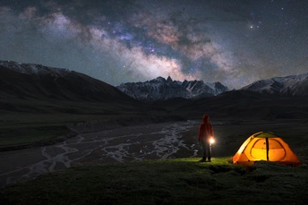 在昆仑山脉东段的一处河谷,我在悬崖边搭起帐篷与银河合影