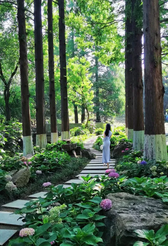 她的身影在林间小径上缓缓前行,仿佛是夏日的精灵,轻盈而神秘。