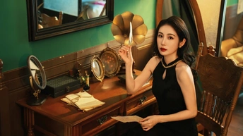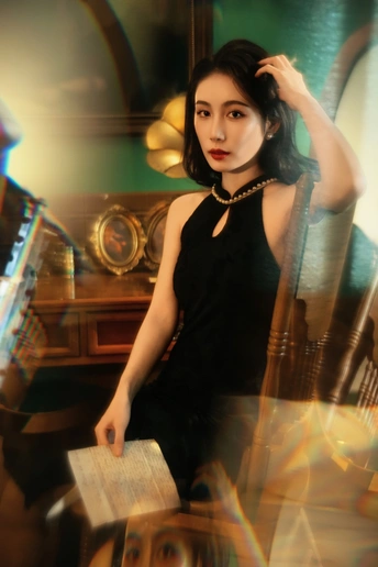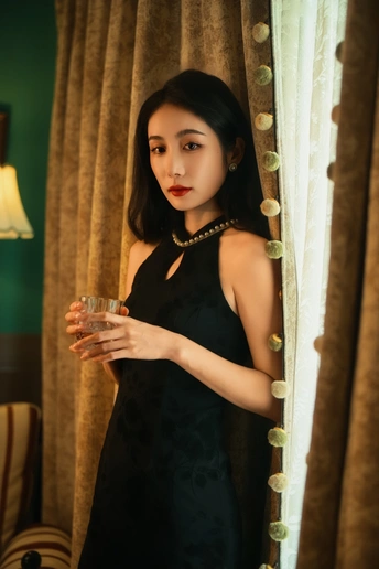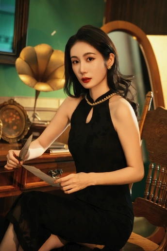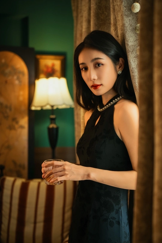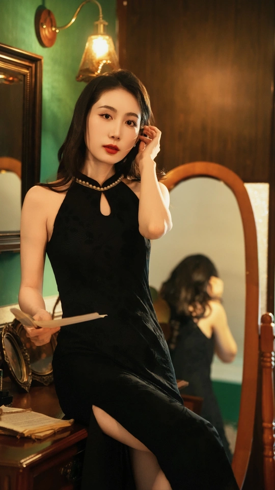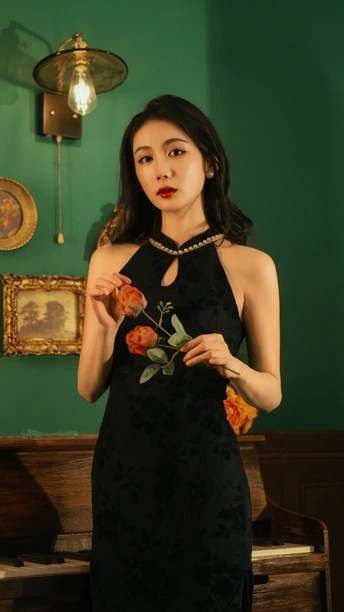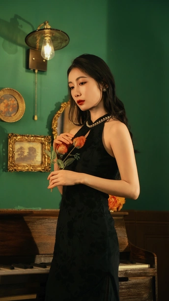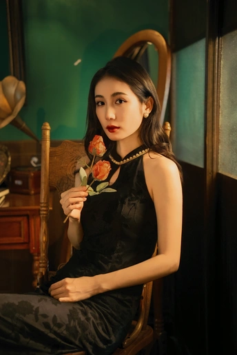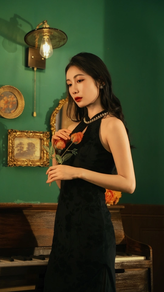 穿梭在复古场景间,仿佛推开旧时光的门🚪 黑旗袍勾勒优雅,珍珠颈链添几分贵气,在老书桌前执笔、沙发旁小酌、钢琴边沉思,每一瞬都像民国电影里的定格🎞️ 手持玫瑰时,恍惚与旧时代的浪漫相遇,复古滤镜晕染出故事感,这组片子,是我与民国美学的一场温柔对话~