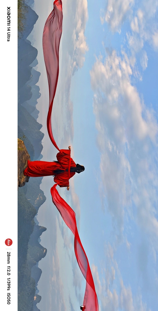 这张照片以宽广的天空和层叠的山峦为背景,营造出一种壮阔而宁静的氛围。人物身着鲜艳的红色服饰,形成了与自然色调的强烈对比,极具视觉冲击力。飘动的红纱带如同灵动的画笔,在空中划出优雅的曲线,赋予画面动感与诗意。构图巧妙地将主体置于画面中央,带来平衡感,同时也引导观者目光穿越山峦,感受天地的辽阔。整体色调柔和而和谐,光影处理细腻,彰显了摄影师对细节与意境的深刻把握,作品不仅美学价值高,更传递出一种自由与超然的精神境界。