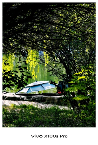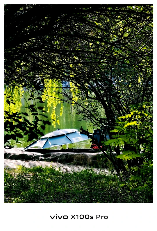 浓荫中,一把伞静静的躺着。旁边的主人好似在钓鱼,他们惬意的享受着生活的闲遐时光。