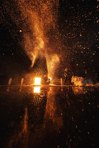 一座土炉,一把火,夜里还在忙碌的身影。 火星飞溅,汗水蒸腾, 没有表演,也不为热闹, 只是为了把今天的事情做完。