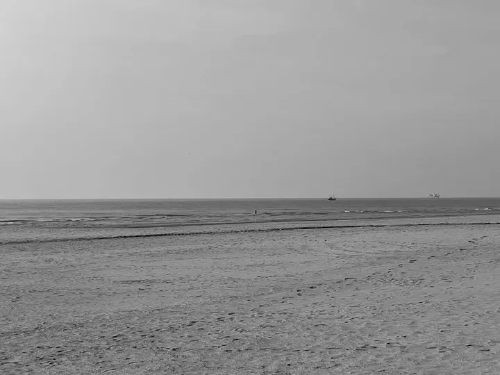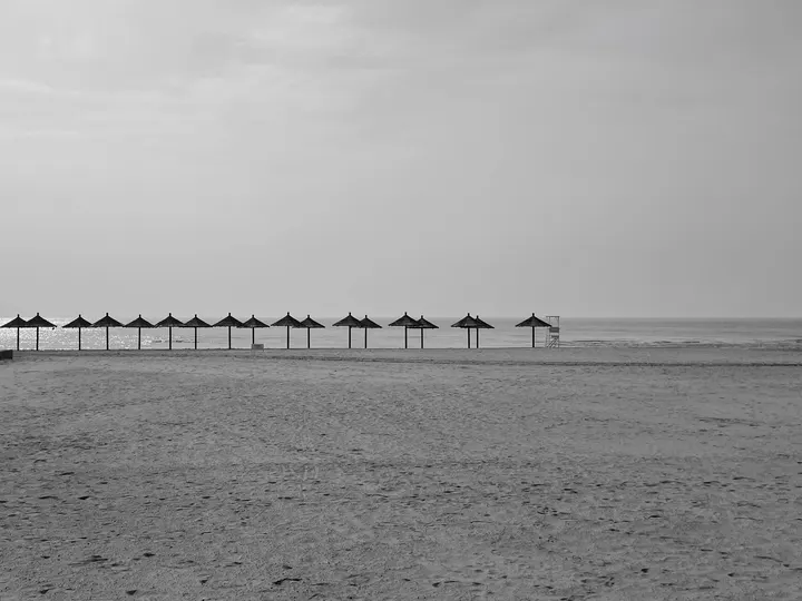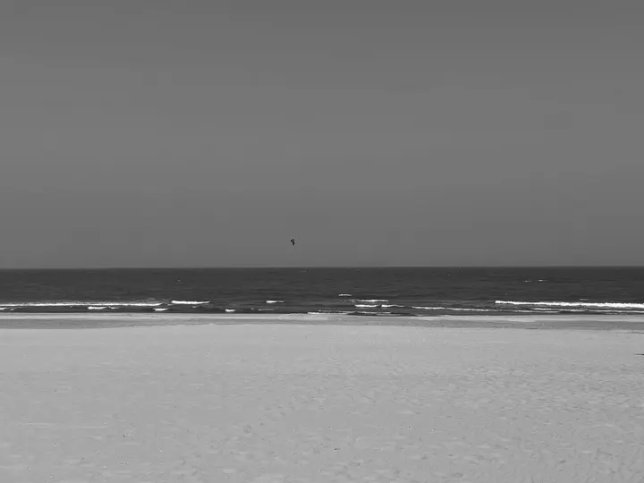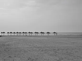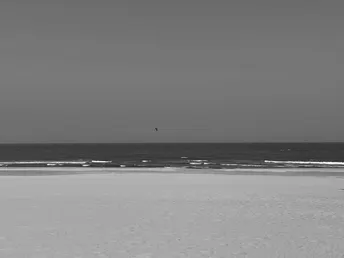 在这黑白的世界里,大海褪去了斑斓色彩,却留下了纯粹的宁静。沙滩如时光的画布,细腻而无声,承载着岁月的足迹。海浪轻拍,似在低语着无人知晓的故事。那远处的船只、飞翔的鸟儿,还有排列整齐的遮阳伞,都成了这静谧画卷中的点缀。没有喧嚣,没有纷扰,只有海与天的交融,时间仿佛在此刻静止,让人沉浸在这一片安宁之中,聆听内心的声音,感受自然的力量与平和 。