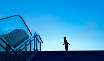 小男孩立于台阶之上,身影坚毅。向着前方未知前行,每一步都是对光明的追逐,拥抱属于自己的天地。
