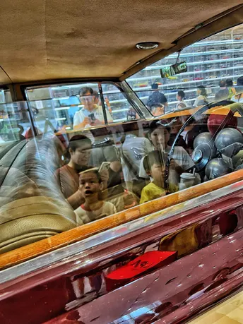 在人们邂逅了这辆经典老爷车,透过车窗,看到了车内精致的内饰和外面人们好奇的目光,仿佛能感受到它曾见证的岁月,这一刻,时光好像都慢了下来。