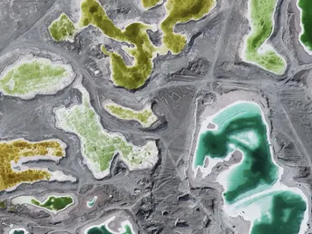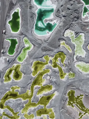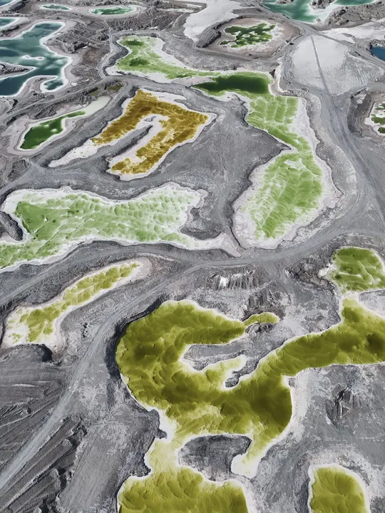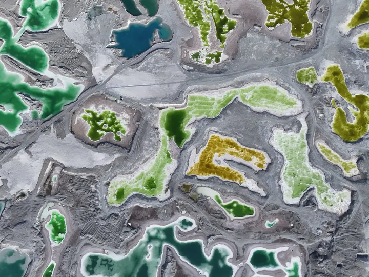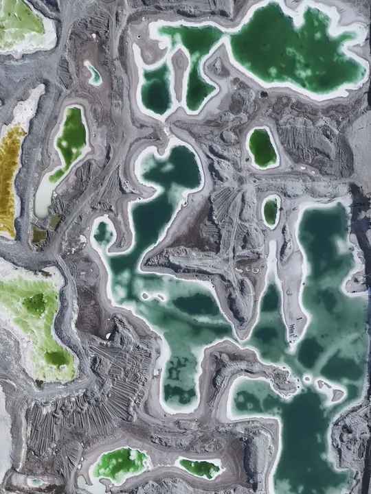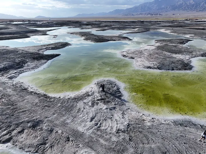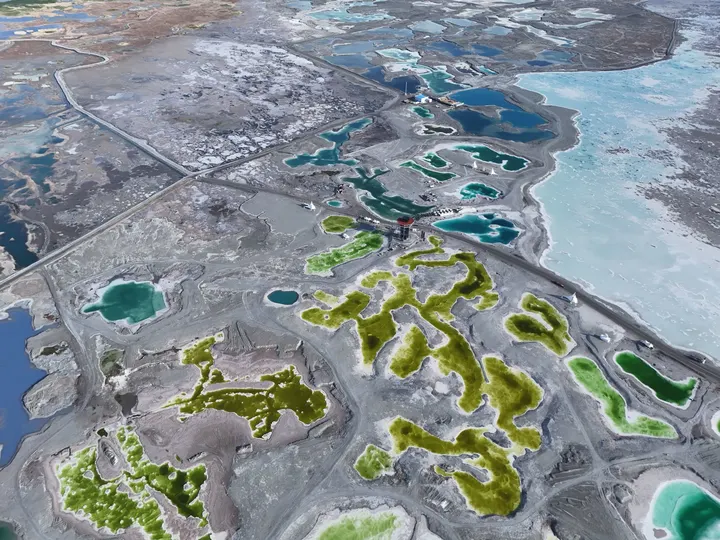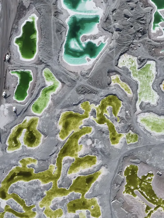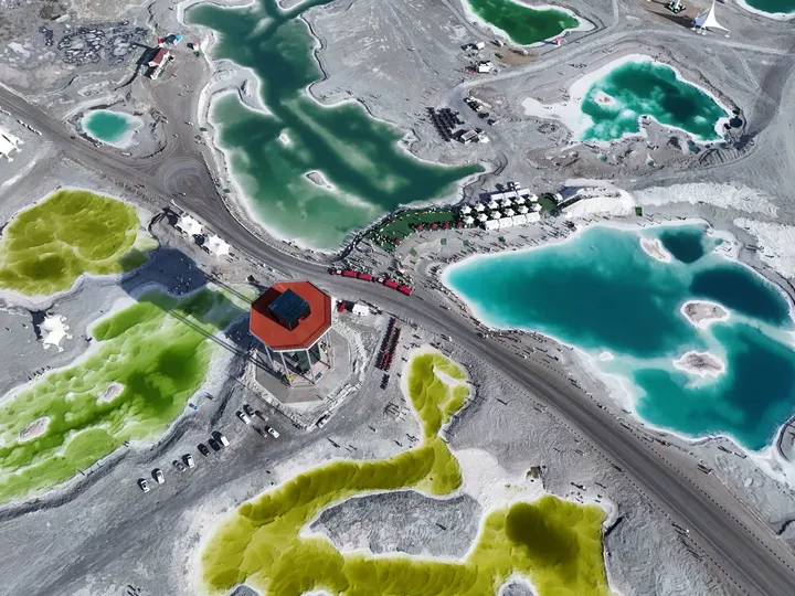 带着察尔汗盐湖那种青苹果绿以外,还有Tiffany蓝、琥珀黄、牛奶白。无数个翡翠色的盐池像被打碎的镜面,镶嵌在茫茫戈壁中。