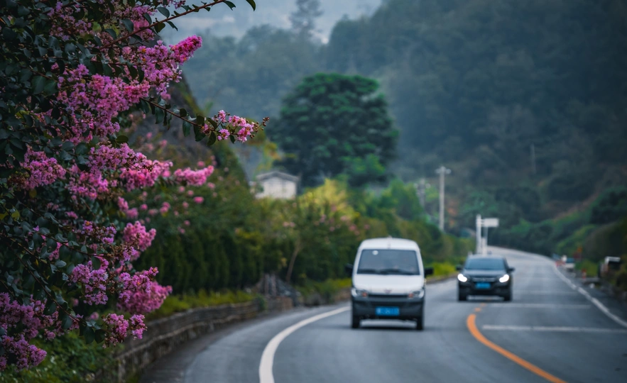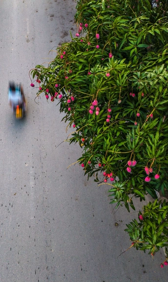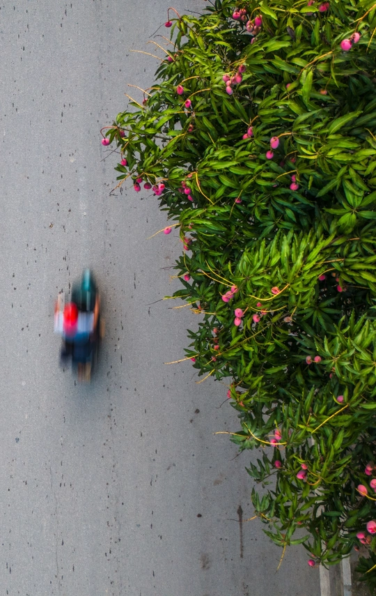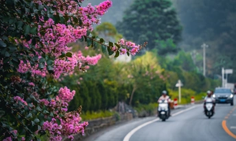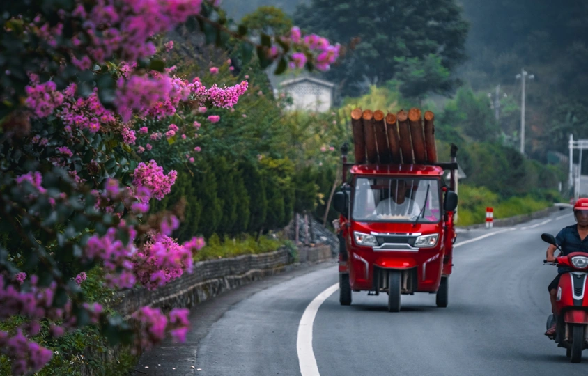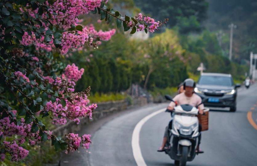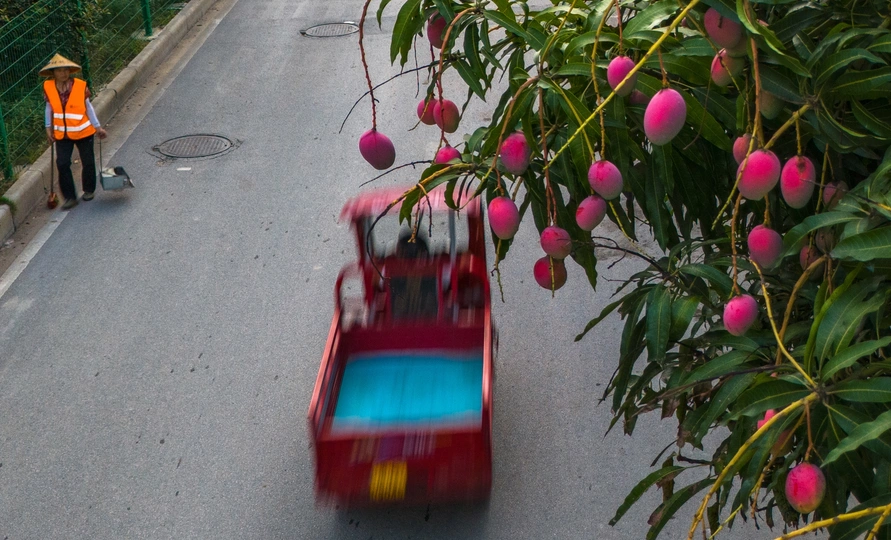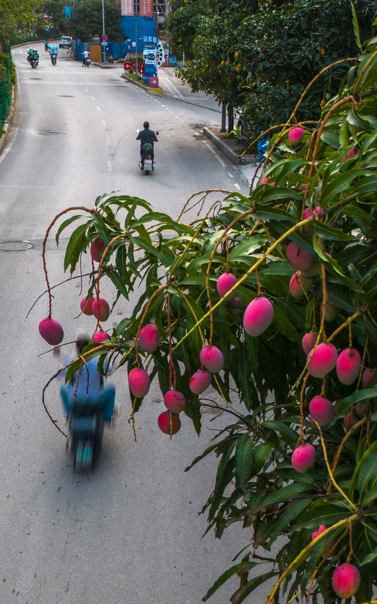 2025年7月13日,贵州省黔西南布依族苗族自治州望谟县县城街道上的绿化树,盛夏的季节鲜红如荔枝的贵妃芒果景观树惹人喜爱,果香四溢。路旁的紫薇花开,车辆驶过时簇拥的花团引风摇摆。生活在这幸福的城市里,一年四季有这样挂满水果、鲜花盛开的街道,小城花果串起了一路旖旎风光。