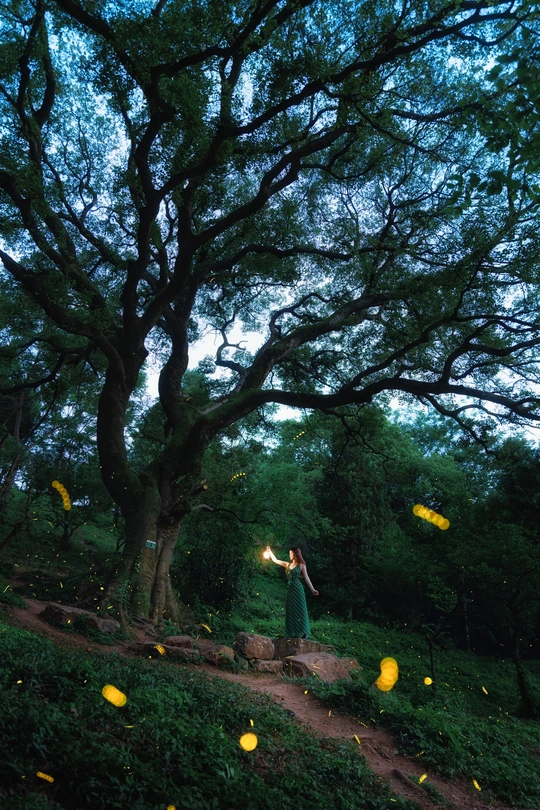 百年朴树守着夜的寂静,绿裙少女盈盈而立。萤火如星子洒落,在树影间与她共舞,编织浪漫绮梦。