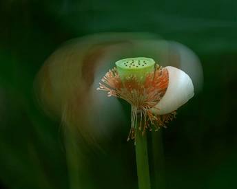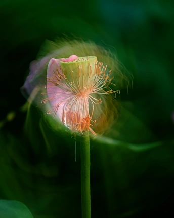 摄于2025年-7日-14日清晨,朝阳区望和公北园,莲蓬,荷瓣凋零不再是衰败,用最朴素形像观告诉世界: 我的谢幕不是熄灭去点亮生命奉献精神再班辉煌。富士中画幅相机GFX100s,镜头100-400mm,(创意摄影多重曝光而得)。