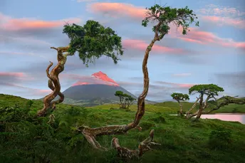 葡萄牙最高峰皮库山是一座位于大西洋中心岛屿的高耸火山,到达此处颇费周折。我找到了两株扭曲的月桂树作为前景的框架,日出时的日照金山光彩夺目