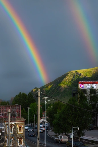本来因为下雨放弃了贡嘎的日照金山,吃晚饭时天空挂出一道双彩虹,弥补了大家的遗憾。