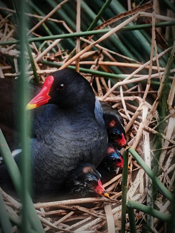 芦苇丛中有一个黑水鸡的窝,一只大鸡护着三只小鸡。看到我在看他们大鸡转了转头。怕惊扰它们,我赶紧拍了几张照片就离开了。