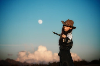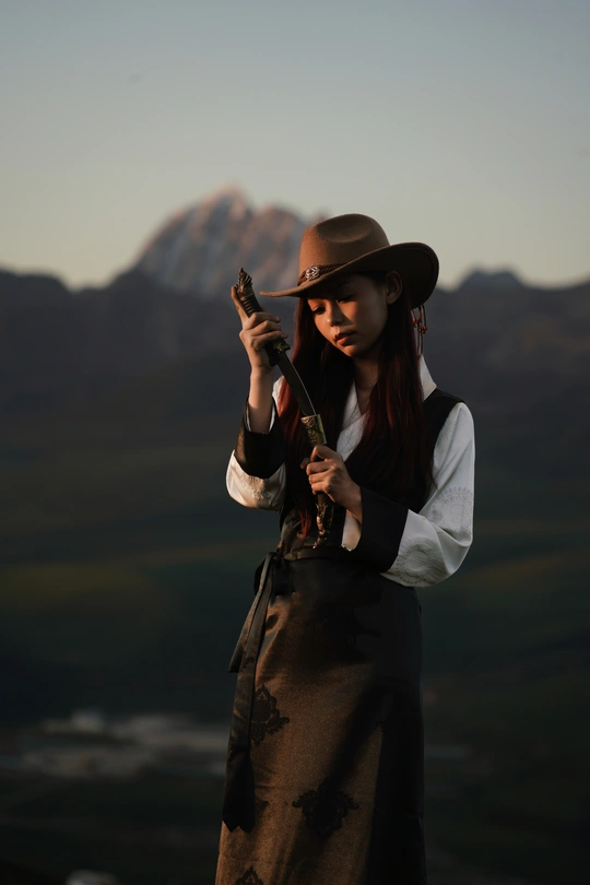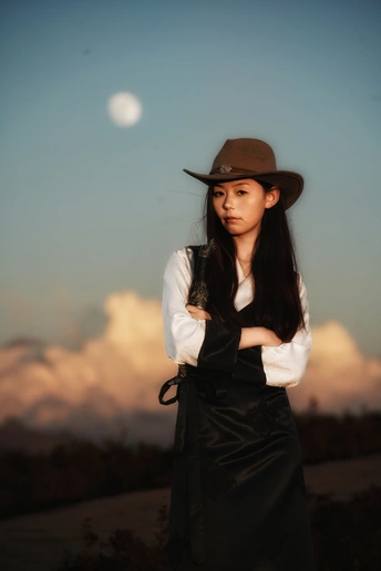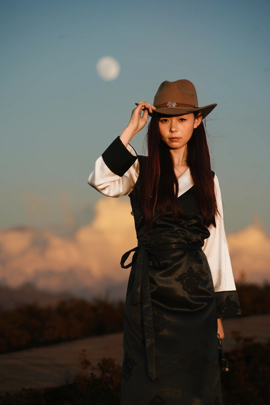 在高原夕阳时刻照着云霞映出金黄,同时出现了罕见的大月亮,有幸在此时刻记录模特的美丽。