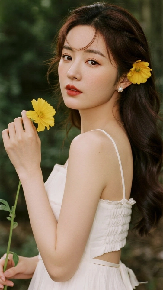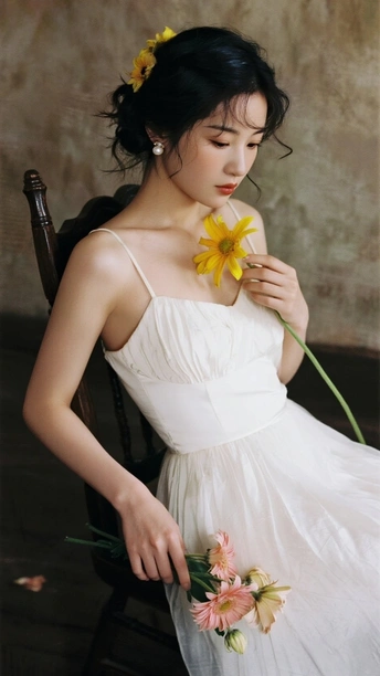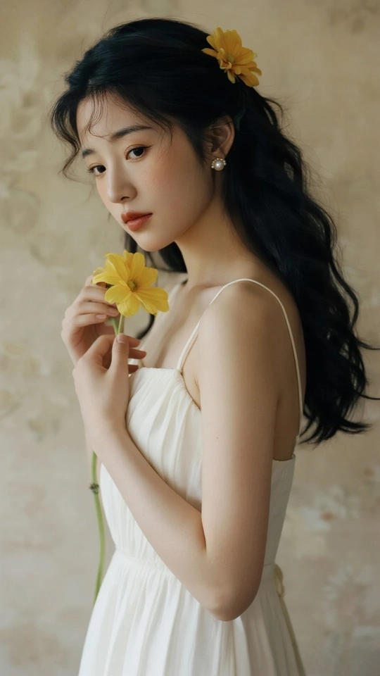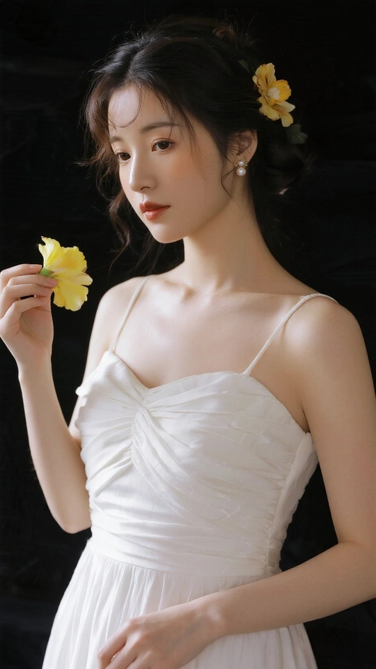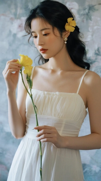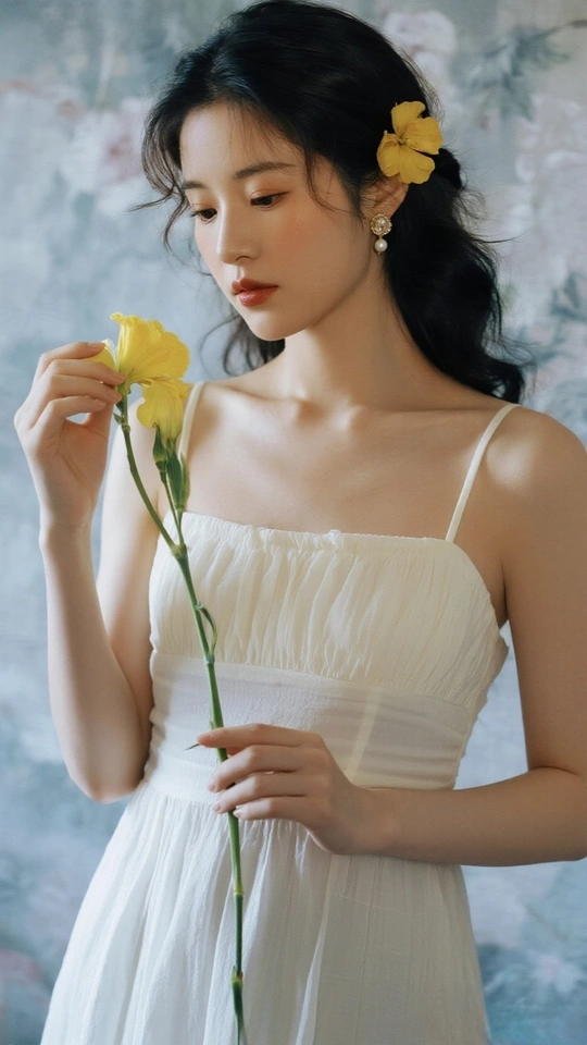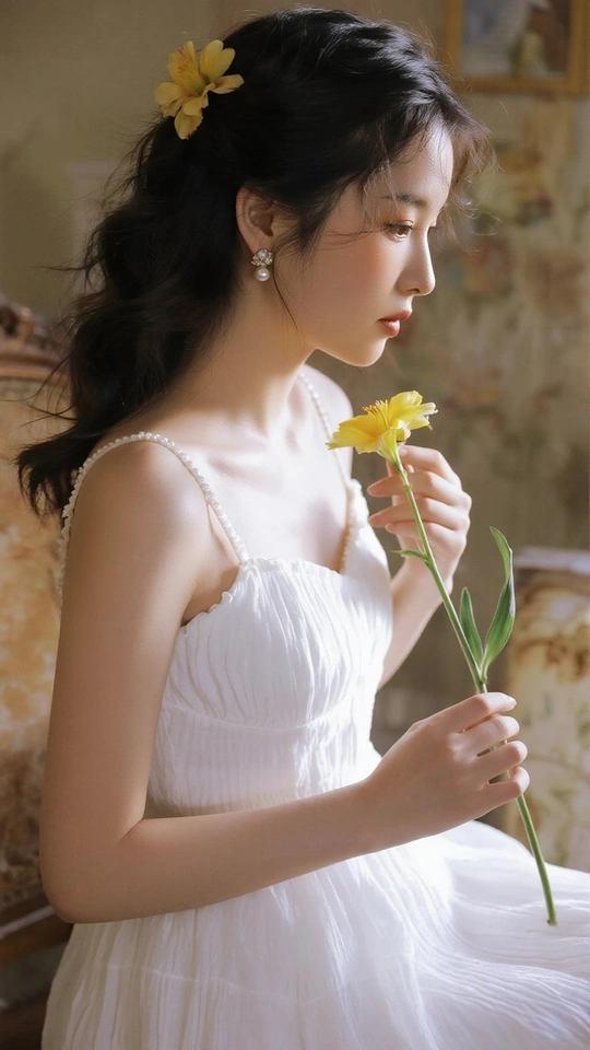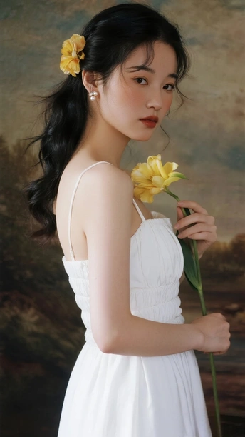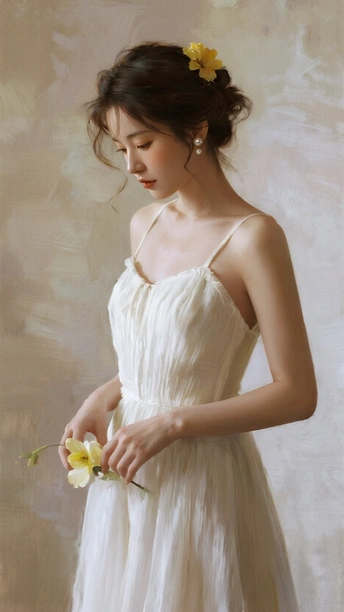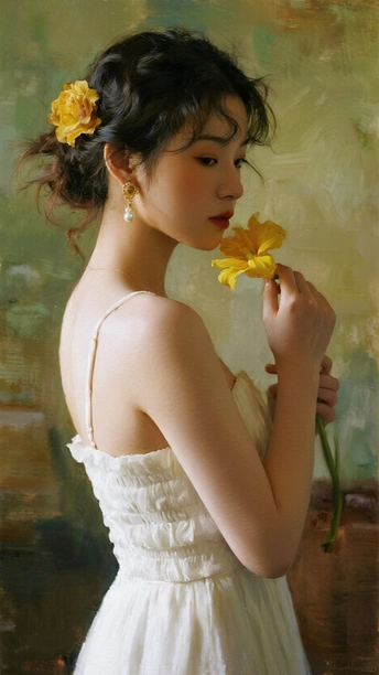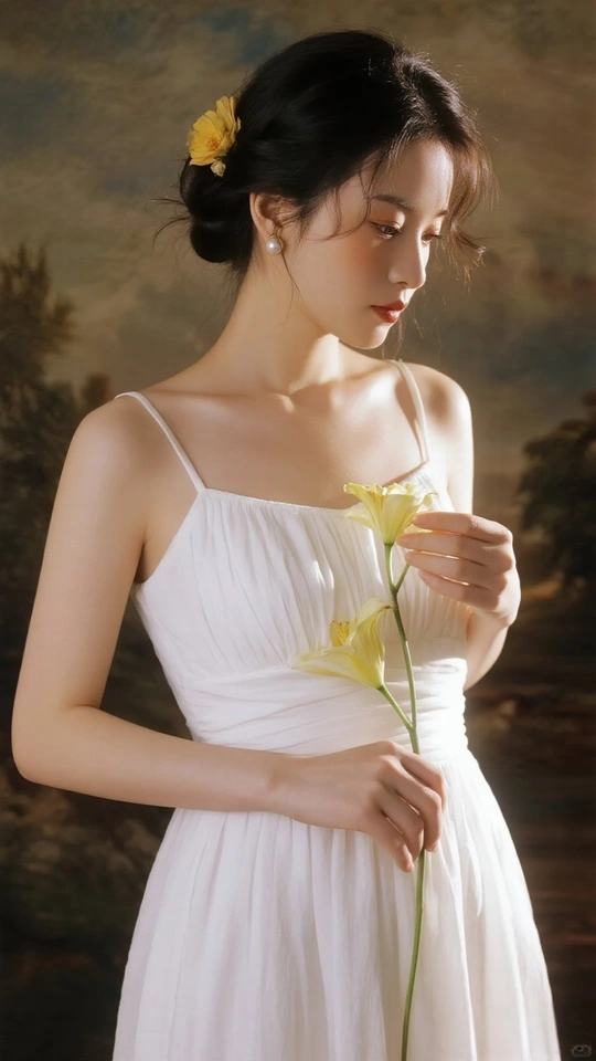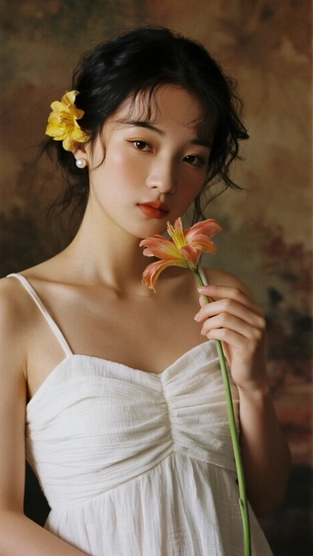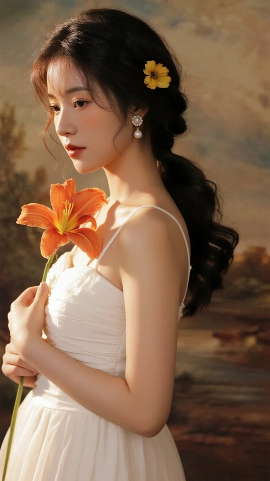 在光的河湾徘徊 她,是一首无声的诗 白裙似初雪的云霭 缠绕着梦的蕾丝 发间的小黄花俏皮 像星子,落于夜的深邃 珍珠耳环轻颤 藏着月光的纯粹 手中的橙百合 燃烧着夏日的火焰 眼眸低垂 似有秘密万千 她站成一幅画 在时光的画廊优雅 花与她,彼此映照 绽出灵魂的芳华