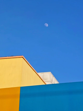 在蓝天与月亮的映衬下,建筑的色彩也显得格外生动,生活中的美好,往往就在这些不经意的瞬间