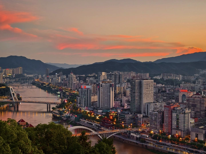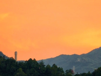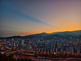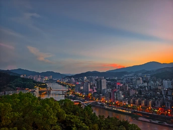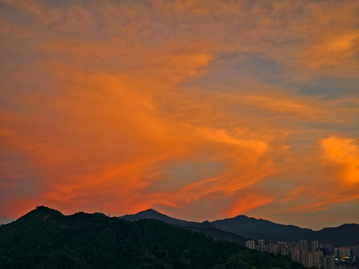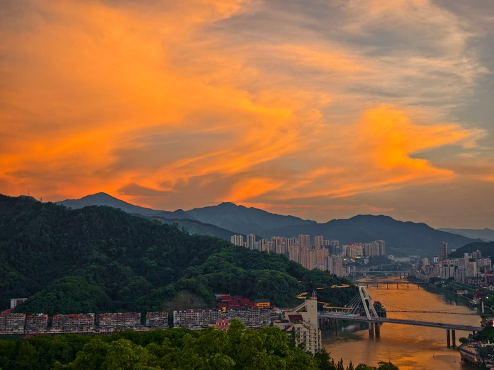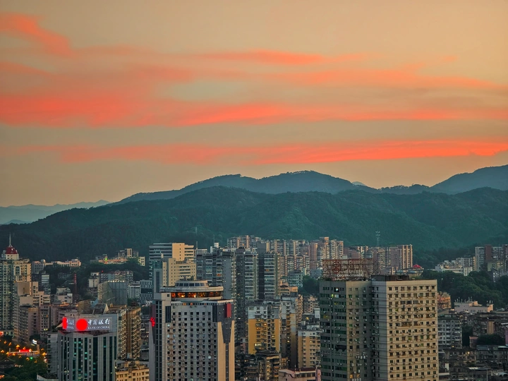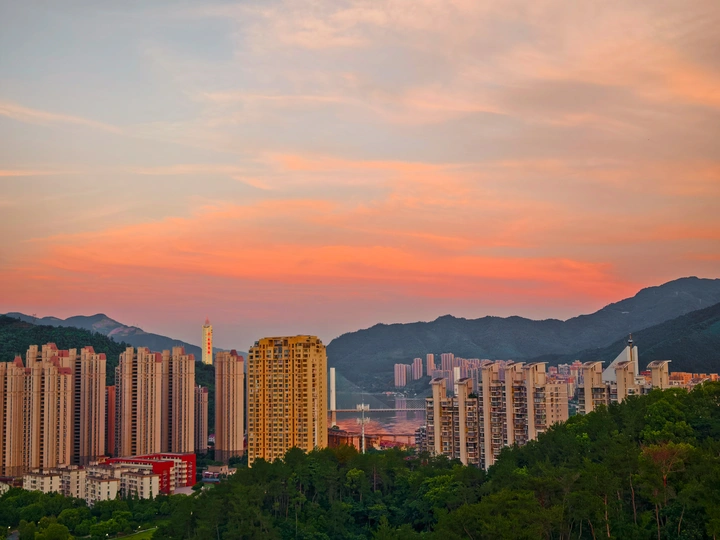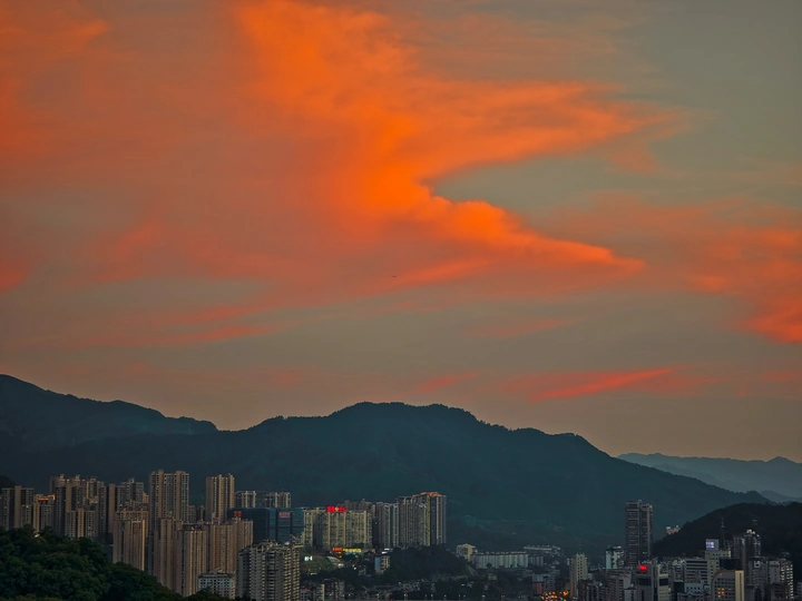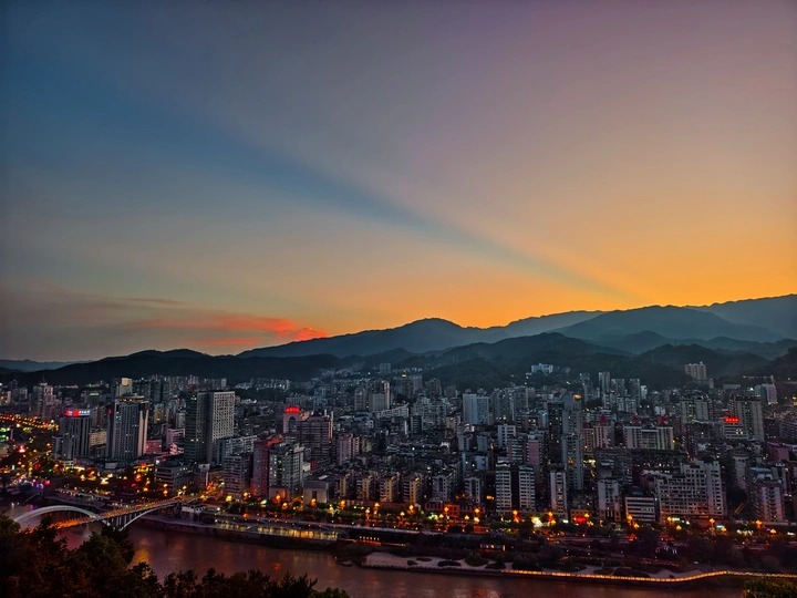 其实在夏季玉屏阁上,能拍到市区全景和晚霞同框是挺难得的。一般来说在夏天的玉屏阁上,太阳落下的位置朝向是水东方向,相比市区的建筑密集度是有些差别的。昨天刚好朝西的位置是没有云的,有云的地方恰好在南边,于是就构成了如此绝美治愈的画面,而在蓝调时刻,由于西边没有云,也惊现了一段被山体切割的耶稣光,昨天的傍晚虽然不是什么世纪烧或者是大烧的火烧云,但是仍然会是十分治愈令人深刻的傍晚
