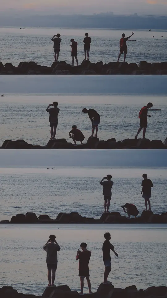 晨雾漫过的海边, 少年们追着日出拍照, 蹲站俯仰,或拍朝阳,或与晨光同框。
