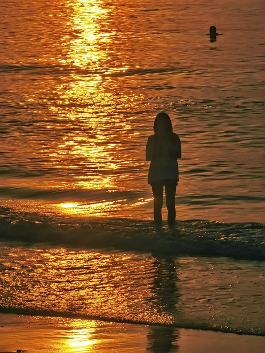 日出照海滩,波光粼粼,人影浮动。