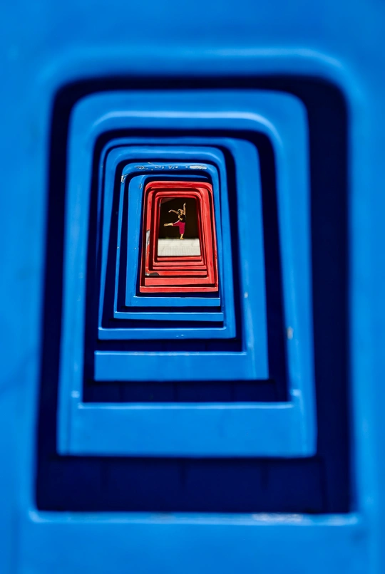 蓝与红交织的几何隧道, 舞者如灵动的光, 在尽头绽放。 每一层框架, 都是时空的褶皱, 而她以舞姿, 刺破单调, 让机械般的秩序里, 开出艺术的花 。