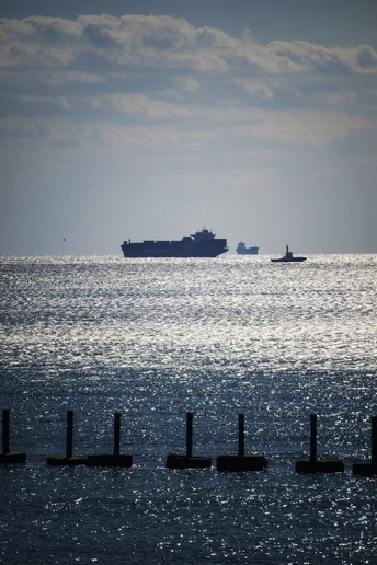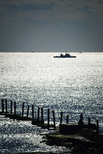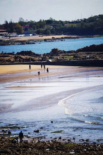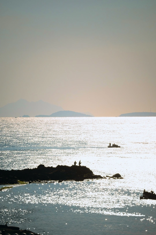 行在海邊,有漁船,不光有打漁的船,還有運載貨物的船隻,大的笨重,小的靈巧。太陽懸掛在空中,灑下光芒,海面一片銀白。遠處有雲霧,飄在小島上,飄在傳說中神仙居住的山上。有人在近處的礁石上垂釣,起起落落,甩動著漁桿。淺灘上,三三兩兩的人羣,彎著腰低著頭,說是在趕海。